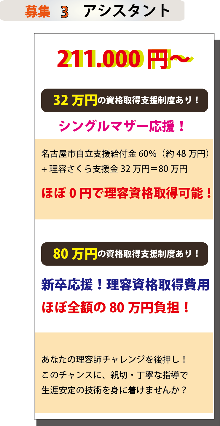 顔そり 25万~28万技術者 28万~36万主任 37万 |
